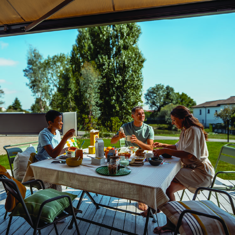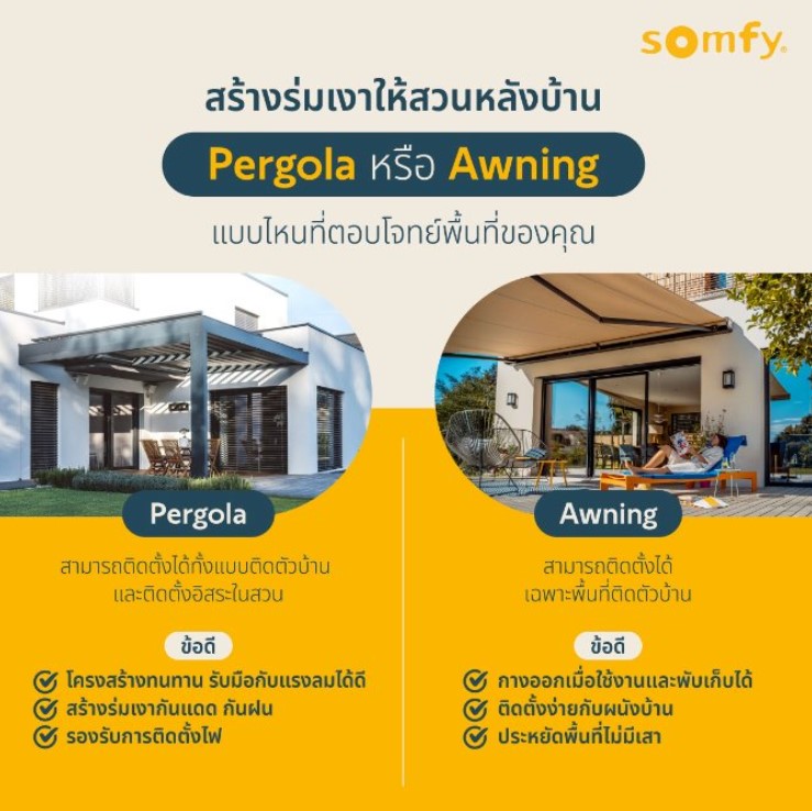 09.04.2026 Tips for your home by Somfy Team สร้างร่มเงาให้พื้นที่นอกบ้าน: ทางออกเพื่อรับมือกับความร้อนในฤดูร้อน ค้นพบแนวทางการจัดการพื้นที่กลางแจ้งอย่างชาญฉลาด ที่ช่วยให้คุณเพลิดเพลินกับความสบาย แสงธรรมชาติ และลดอุณหภูมิความร้อนในฤดูร้อน เลือกประเภทการบังแดดให้เหมาะกับการใช้งานและทิศทางแสงแดด คำถามแรกที่คือ: ช่วงเวลาไหนของวันที่สวนหลังบ้านของคุณเริ่มรู้สึกไม่สบาย? เป็นช่วงมื้อกลางวัน เวลาที่เด็ก ๆ ออกมาทานของว่าง หรือช่วงเย็นหลังเลิกงาน? การเข้าใจทิศทางและช่วงเวลาที่แสงแดดส่องเข้ามาในพื้นที่ของคุณเป็นสิ่งสำคัญ เพื่อเลือกและติดตั้งระบบบังแดดให้เหมาะสม ขนาดของพื้นที่กลางแจ้งก็มีผลต่อการเลือกโครงสร้างเช่นกัน หากเป็น ระเบียงอพาร์ตเมนต์ ร่มแบบเสากลางเยื้องศูนย์ หรือผ้าใบกันแดดทรงสามเหลี่ยมจะช่วยให้ใช้งานพื้นที่ได้อย่างมีประสิทธิภาพโดยไม่ทำให้ดูอึดอัด สำหรับพื้นที่รับประทานอาหารกลางแจ้ง กันสาดแบบปรับองศาได้ สามารถปรับตามการเคลื่อนที่ของดวงอาทิตย์ได้อย่างลงตัว ดังนั้น การเลือกโซลูชันควรพิจารณาจาก ขนาด ทิศทาง และการใช้งานของพื้นที่กลางแจ้ง ยิ่งพื้นที่ได้รับแสงแดดมากเท่าไร ก็ยิ่งจำเป็นต้องมีร่มเงาที่ครอบคลุมและมีประสิทธิภาพมากขึ้น Pergola หรือกันสาด (Awning) ควรเลือกแบบไหนดี? Pergola ไม่ว่าจะเป็นแบบผ้าใบเลื่อนเปิด–ปิดได้ หรือแบบใบระแนงปรับองศาได้ สามารถสร้างพื้นที่ใช้งานเฉพาะตัวได้อย่างชัดเจน สามารถติดตั้งได้หลายรูปแบบ ทั้งแบบติดกับตัวบ้านเพื่อความต่อเนื่องของดีไซน์ หรือแบบตั้งอิสระกลางสวน เช่น bioclimatic pergola Pergola ไม่เพียงช่วยเพิ่มความสวยงาม แต่ยังช่วยสร้างร่มเงา ทำให้คุณสามารถใช้พื้นที่กลางแจ้งได้เกือบตลอดทั้งปี โดยเฉพาะหากเพิ่มอุปกรณ์ป้องกันด้านข้าง เช่น ม่านแนวตั้ง โซลูชันเหล่านี้ช่วยป้องกันแสงแดด ลมหนาว ยุง และฝน อีกทั้งยังสามารถติดตั้งระบบไฟส่องสว่างเพิ่มเติมได้ด้วย ในขณะที่ กันสาด (Awning) มีดีไซน์เรียบง่ายและไม่เกะกะ สามารถกางออกเมื่อต้องการใช้งานและเก็บได้เมื่อฝนตก ติดตั้งบนผนังบ้านได้ง่าย ช่วยป้องกันทั้งพื้นที่ภายนอกและภายในบ้านจากแสงแดด และหากติดตั้งระบบมอเตอร์ก็จะใช้งานได้สะดวกมากขึ้น อีกทั้งยังไม่กินพื้นที่พื้น เพราะไม่ต้องมีเสารองรับ ความสำคัญของระบบป้องกันแสงแดดอัตโนมัติ ฤดูร้อนในปัจจุบันมีแนวโน้มร้อนขึ้นเรื่อย ๆ ทำให้การมีระบบบังแดดสำหรับเทอเรสหรือระเบียงกลายเป็นสิ่งจำเป็น ไม่เพียงเพื่อความสบาย แต่ยังช่วย ป้องกันรังสี UV ไม่ให้เข้าสู่ตัวบ้าน ช่วยรักษาอุณหภูมิภายในให้เย็น
