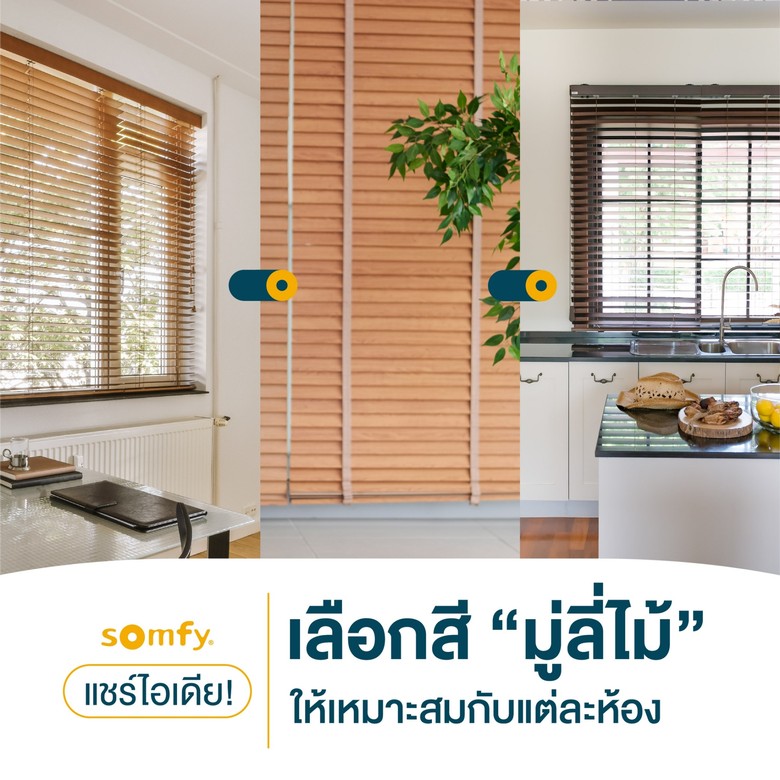 15.03.2024 Tips For Your Home บทความโดย Somfy Thailand แชร์ไอเดีย! เลือกสี “มู่ลี่ไม้” ให้เหมาะสมกับแต่ละห้อง “มู่ลี่ไม้” เป็นอีกหนึ่งประเภทของม่านที่เป็นที่นิยมในการตกแต่งบ้าน เพราะนอกจากจะทำให้บ้านดูไม่มืดทึบหรืออึดอัดจนเกินไป มู่ลี่ไม้ก็ยังมีดีไซน์ที่ดูเรียบหรูคลาสสิกจึงสามารถนำมาตกแต่งได้ทุกห้องอีกด้วย ในปัจจุบันนี้มู่ลี่ไม้ ก็ไม่ได้มีแค่สีของไม้เท่านั้น แต่มีให้เลือกมากมายหลากหลายสี เพื่อให้เหมาะกับการแต่งบ้านหลาย ๆ สไตล์ ซึ่งวันนี้ Somfy ก็จะมาแชร์ไอเดีย! เลือกสี “มู่ลี่ไม้” ให้เหมาะสมกับแต่ละห้อง ให้กับคนที่สนใจใช้มู่ลี่ไม้มาตกแต่งบ้านกัน เลือกสี “มู่ลี่ไม้” ให้เหมาะสมกับแต่ละห้อง จริง ๆ แล้วหลักการเลือกสีมู่ลี่ไม้นั้นไม่มีถูกหรือผิดซะทีเดียว เพราะส่วนใหญ่การตัดสินใจก็เป็นไปตามความชอบส่วนบุคคล แต่สำหรับใครที่ยังเลือกไม่ได้ว่าสีที่เลือกจะเหมาะสมกับการตกแต่งห้องหรือไม่ ก็มาอ่านกันได้เลย! การเลือกสีมู่ลี่ไม้ ให้เหมาะกับแต่ละห้องนั้น อย่างแรกเลยก็คือให้ดูบรรยากาศโดยรวมของห้องก่อน อย่างเช่น สีของเฟอร์นิเจอร์ สีของผนังห้อง และสีของพื้นเป็นหลัก ว่าเป็นไปในทิศทางไหน เมื่อดูองค์ประกอบเหล่านี้แล้วก็จะช่วยให้คุณเลือกใช้สีที่เหมาะสมได้ง่ายขึ้นนั่นเอง ห้องนอน ห้องนอนเป็นห้องที่ใช้สำหรับการพักผ่อนและเป็นพื้นที่ส่วนตัว ดังนั้น การเลือกสีมู่ลี่ไม้จึงควรเลือกจากความชอบเป็นหลัก แต่ถ้าใครอยากเลือกสีให้เหมาะกับการพักผ่อน Somfy ขอแนะนำเป็นสี Earth Tone หรือโทนธรรมชาติ จะช่วยสร้างบรรยากาศให้ห้องนอนของคุณดูอบอุ่นเหมาะกับการพักผ่อนมากยิ่งขึ้น ห้องรับแขก เป็นอีกหนึ่งห้องที่ถือว่าเป็นหน้าเป็นตาให้กับบ้าน เพราะเป็นห้องที่บ่งบอกรสนิยมของเจ้าบ้านได้เลยทีเดียว ถ้าใครที่อยากให้ห้องรับแขกมีความหรูดูดี ควรเลือกสีมู่ลี่ไม้โทนสีน้ำตาลเข้ม เช่น สีน้ำตาลช็อกโกแลตหรือสีไม้สัก เป็นต้น ห้องทำงาน ห้องนี้เป็นห้องที่ต้องมีความเงียบสงบ แต่ก็ต้องไม่ดูอึดอัดจนเกินไป ดังนั้นการเลือกสีมู่ลี่ไม้จึงควรใช้โทนสีเทา เพื่อสร้างบรรยากาศที่ดูสุขุม เรียบง่าย จริงจัง เหมาะกับการทำงานที่ต้องใช้สมาธิ ถ้าหากอยากให้ห้องดูกว้างโล่งให้ใช้สีเทาอ่อน แต่ถ้าอยากได้ความเคร่งขรึมให้ใช้สีเทาเข้ม ห้องรับประทานอาหาร สำหรับห้องนี้ Somfy ขอแนะนำให้เลือกสีมู่ลี่ไม้อย่างสีน้ำตาลมะฮอกกานีและสีโรส เพื่อเพิ่มสีสันในห้องรับประทานอาหารให้ดูมีสีสันไม่น่าเบื่อจนเกินไป และนี่คือไอเดียการเลือกสีมู่ลี่ไม้ให้เหมาะสมกับแต่ละห้อง นอกจากนี้ยังส
